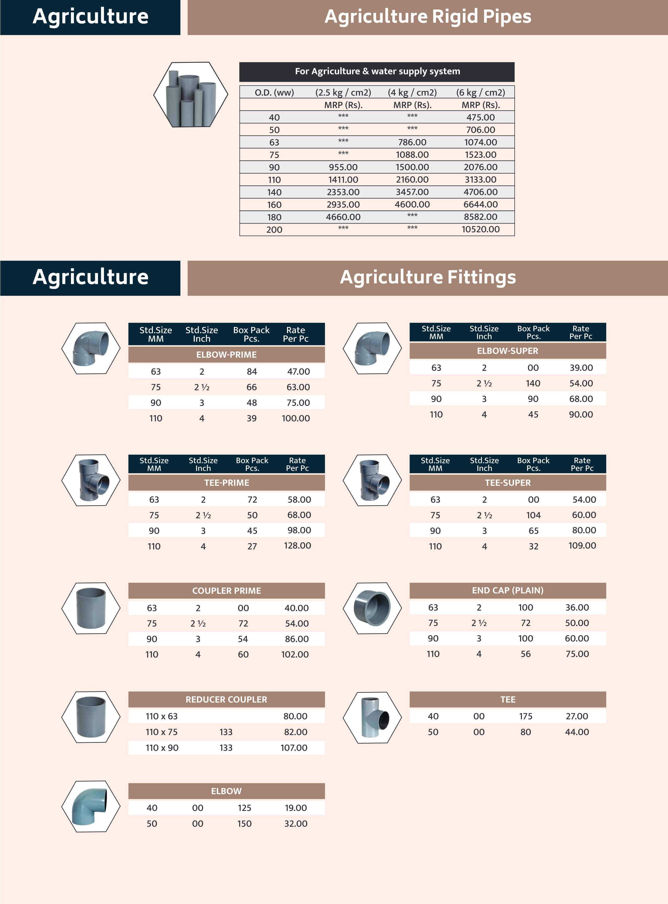Agriculture Plumbing System pipes provide a long-lasting and reliable solution for efficient water supply and irrigation management. These pipes are specially designed to withstand harsh outdoor conditions, ensuring strength, durability, and corrosion resistance. They are lightweight, easy to install, and require minimal maintenance, making them ideal for agricultural fields and farms. With a smooth inner surface, the pipes allow for a steady and uninterrupted flow of water, improving irrigation efficiency and crop productivity. Overall, Agriculture Plumbing Systems offer a cost-effective, durable, and sustainable solution for modern farming and irrigation needs.